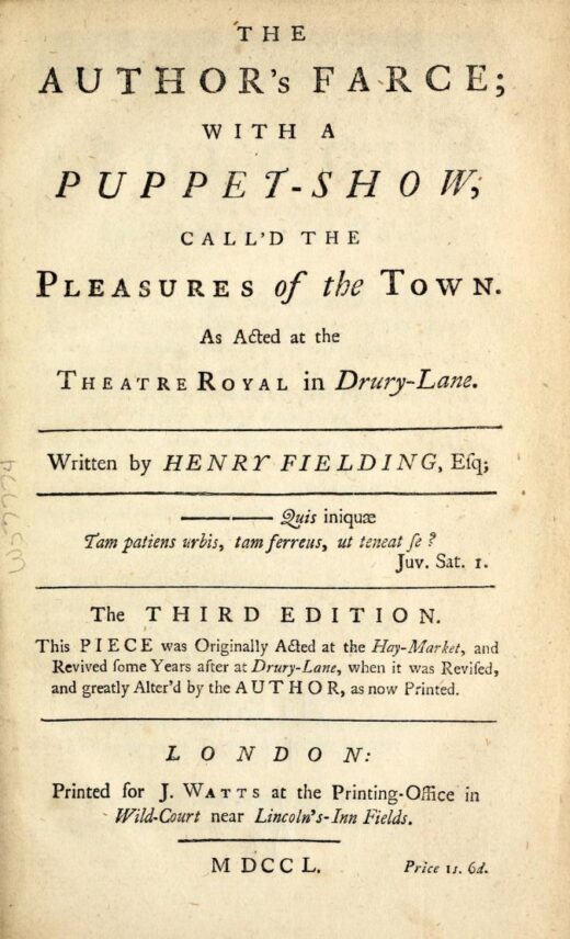 Henry Fielding, The Author's Farce; with a Puppet-Show, call'd The Pleasures of the Town, London: J. Watts, 1750 [3rd edition].