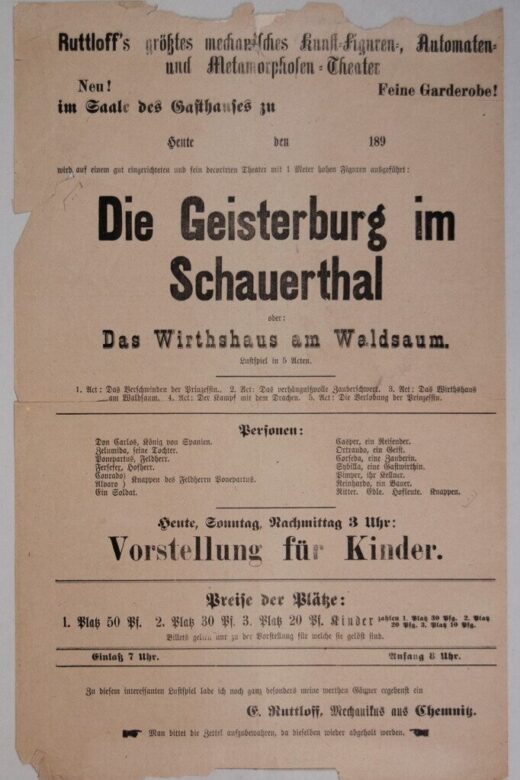 Der Kampf mit dem Drachen (Le Combat avec le dragon) une pièce était très appréciée en Allemagne au 19e siècle. Le fait que sa présence soit alors attestée aussi bien en Saxe que dans le Pays de Bade laisse supposer que son origine est plus ancienne. La version ici décrite est celle du marionnettiste Carl Eduard Ruttloff (1850-1890). Elle a été copiée en 1875 à Gommern près de Pirna (Saxe). En 1914, le collectionneur de pièces pour marionnettes Kollmann a acquis ce texte en même temps que la totalité du fonds Ruttloff de la veuve du marionnettiste, Emilie Ruttloff (1845-?). Le manuscrit est aujourd'hui conservé dans la Puppentheatersammlung de Dresde (D4-690).